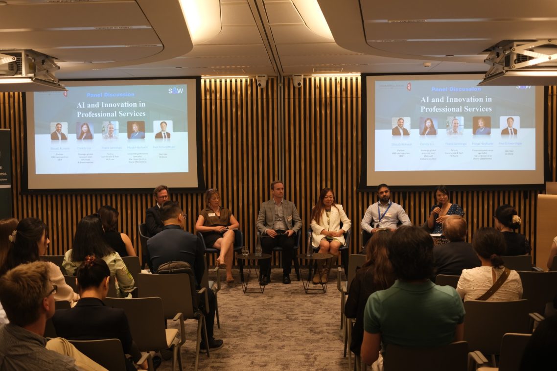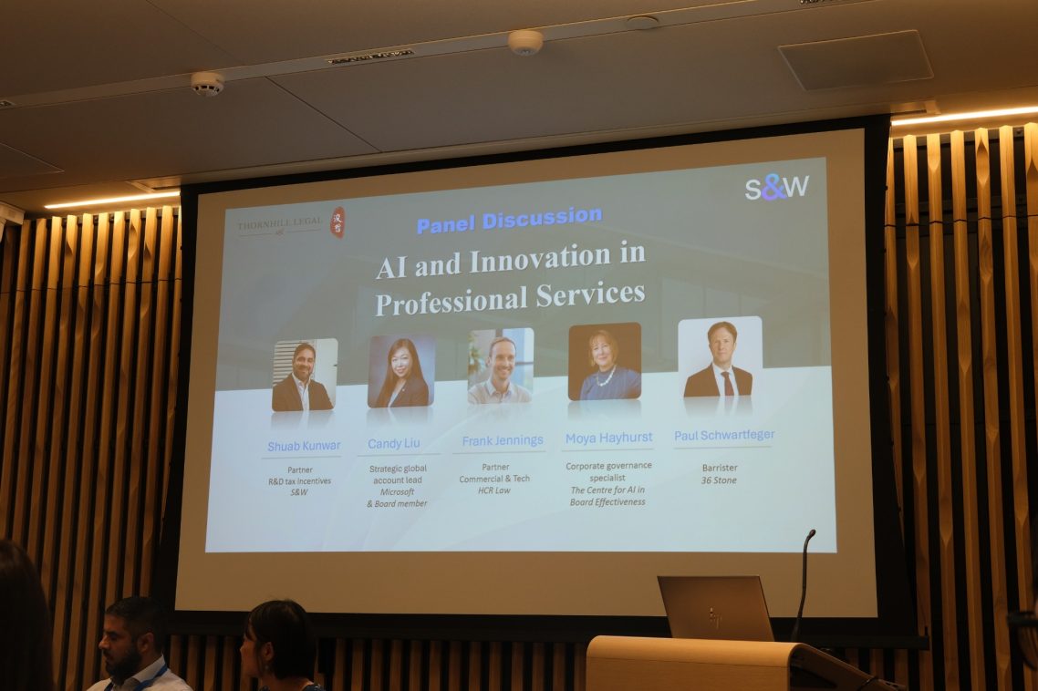 The formal part of the event featured a panel discussion titled “AI in professional services”. Moderated by Thornhill Legal’s director of international markets, Yun Kriegler, the panel brought together five leading minds from across the technology and professional services landscape: Candy Liu, strategic global account lead at Microsoft; Frank Jennings, partner at HCR Law; Paul Schwartfeger, barrister at 36 Stone; Shuab Kunwar, R&D tax partner at S&W; and Moya Hayhurst, corporate governance expert and researcher at the Centre for AI in Board Effectiveness.