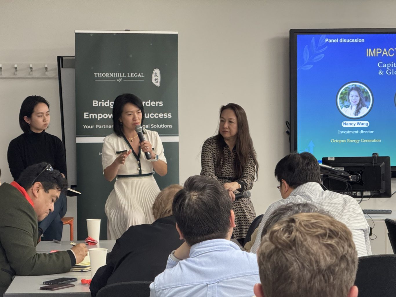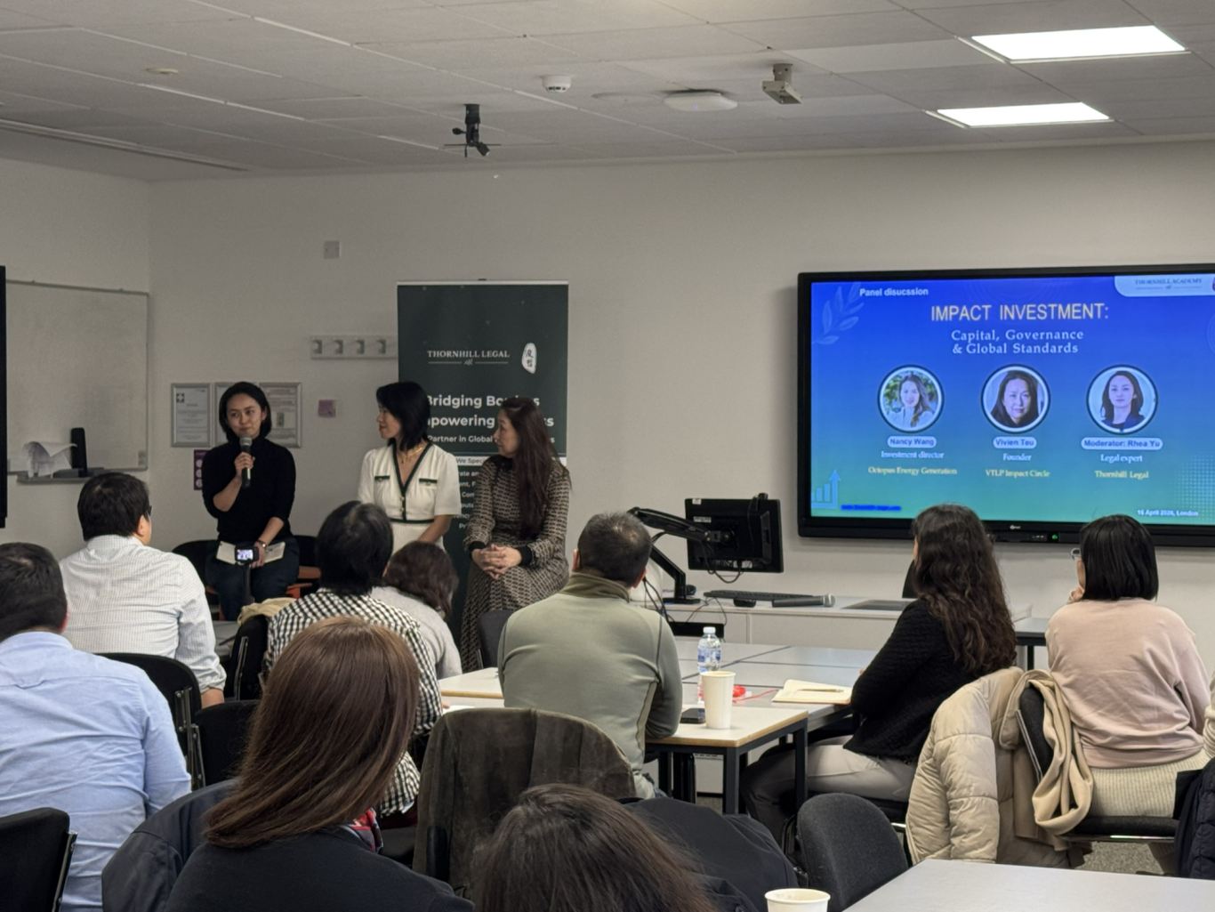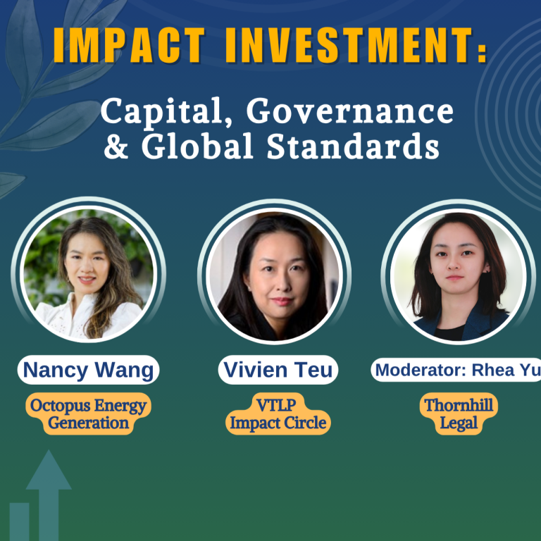 Titled “Impact Investment: Capital, Governance and Global Standards”, the panel discussion featured three experienced experts: Nancy Wang, investment director of Octopus Energy Generation; Vivien Teu, founder of VTLP Impact Circle; and Rhea Yu, senior associate at Thornhill Legal. Together, they shared insights on the latest developments of impact investing across UK, Europe and Asia, and engaged with the audience in a lively and open debate over what impact investing really means in today's global markets.